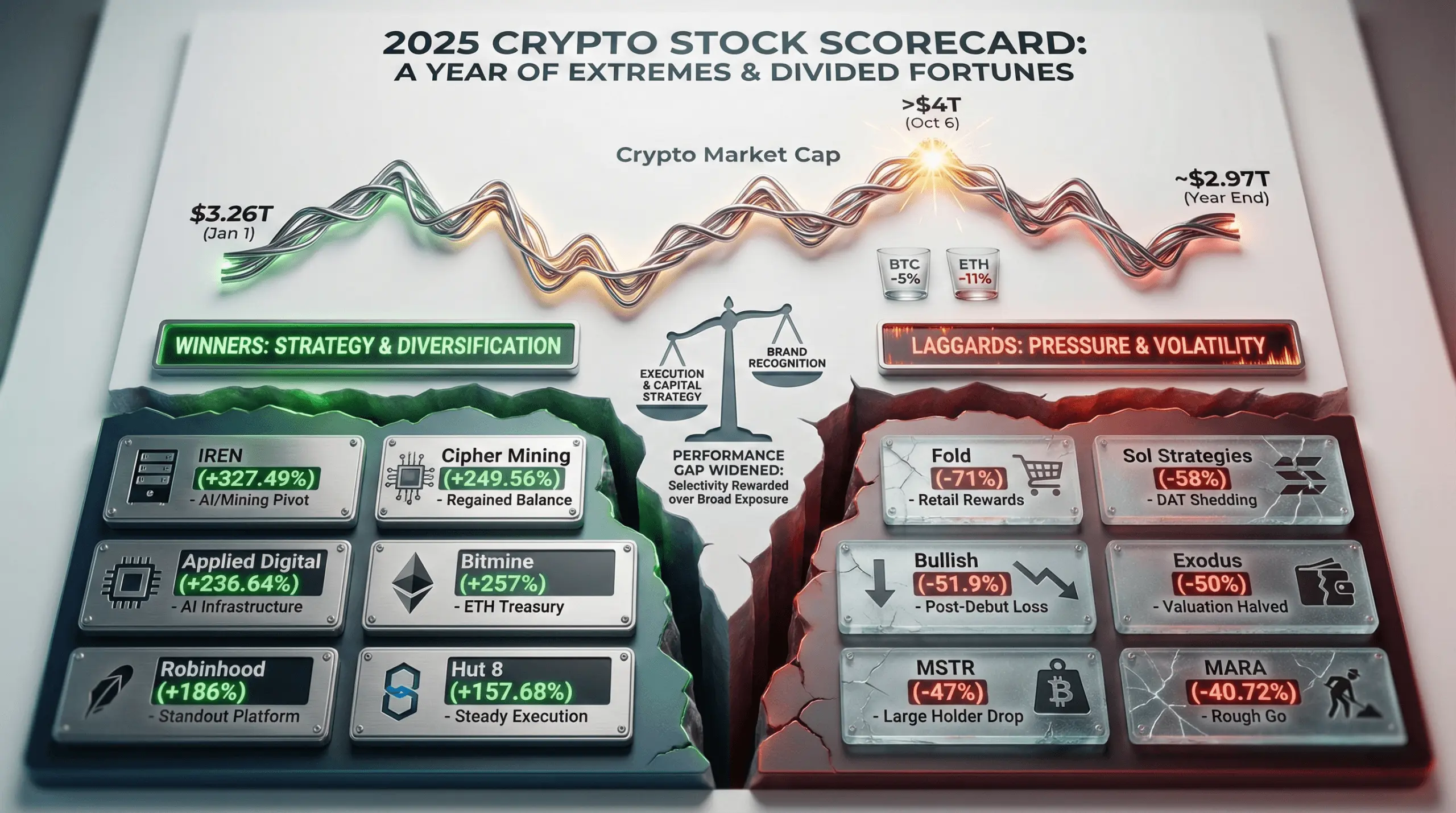 Na metade do ano — e novamente durante a primeira semana de outubro — o mercado cripto brevemente ultrapassou a marca de $4 trilhão, com o BTC subindo acima de $126.000 em 6 de outubro. Toda essa movimentação refletiu-se diretamente nas ações de criptomoedas, elevando algumas enquanto outras ficaram para trás ao longo de 2025. Aqui está um resumo de exatamente como esses nomes se comportaram durante os 12 meses de uma jornada nada entediante.