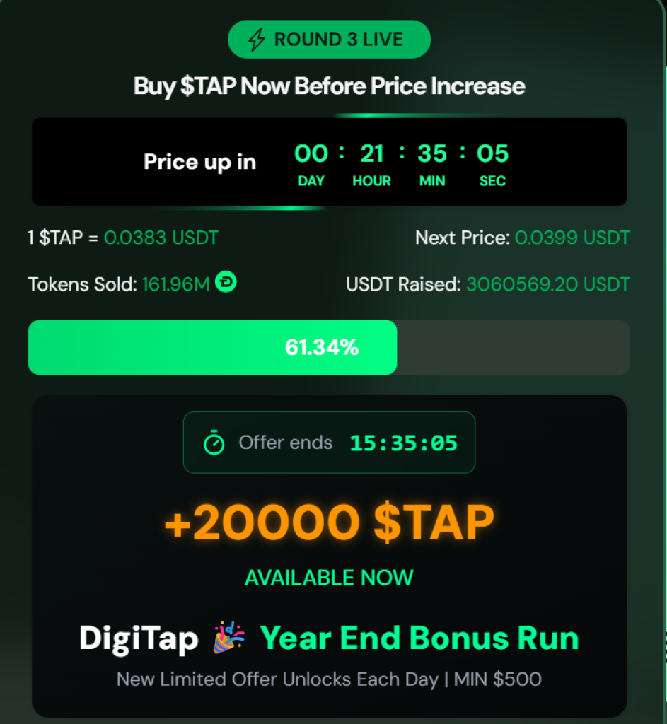 Investidores iniciais que participaram na pré-venda na sua fase inicial, quando o preço era $0.0125, agora desfrutam de um lucro de papel de mais de 200% de ROI, com $TAP a ser oferecido a $0.0383. Curiosamente, a ronda 3 da sua pré-venda está a 61% concluída, o que significa que ainda há alguns tokens de pré-venda disponíveis ao preço atual.
