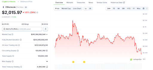 No momento da escrita, ETH está a negociar por $2.015,97 e registou um aumento de 4,79% nos últimos 7 dias.