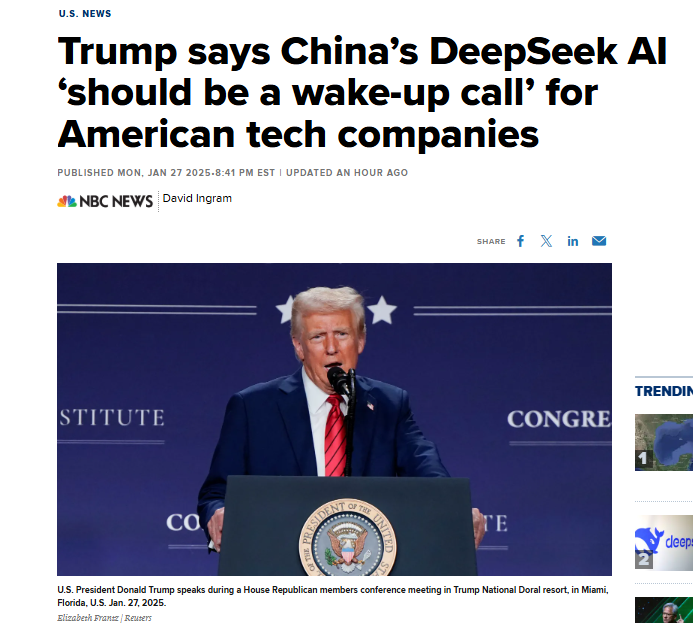 Trump: The rise of DeepSeek should sound the alarm for American enterprises.