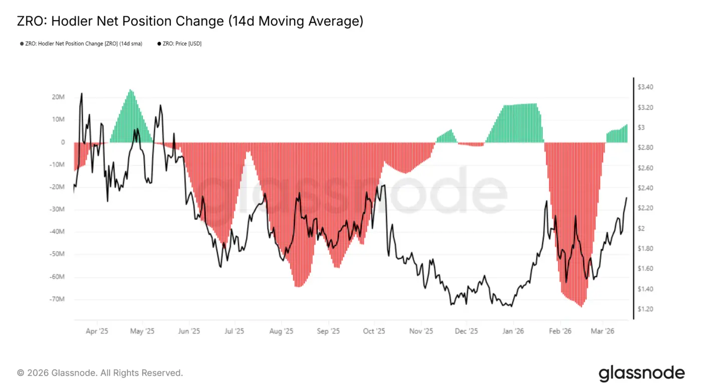 O preço do ZRO subiu cerca de 60%, de US$1,49 para US$2,50 — uma resistência chave que se mantém desde a segunda metade de 2025. Nos meses de janeiro e fevereiro, todos os esforços de recuperação foram bloqueados nesta zona.