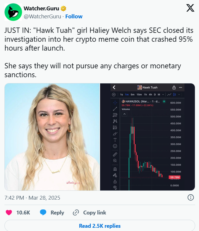 В декабре 2024 года, когда мем-токен $HAWK, поддерживаемый интернет-знаменитостью Хейли Уэлч (более известной под ее противоречивым прозвищем «Плюющийся орел»), появился на свет, эта мем-волна мгновенно взорвала рынок. Всего за несколько часов рыночная капитализация этого токена взлетела почти до 500 миллионов долларов, но затем она рухнула с еще более удивительной скоростью, капитализация испарилась на более чем 90%, что привело к тому, что тысячи розничных инвесторов потеряли все свои деньги.