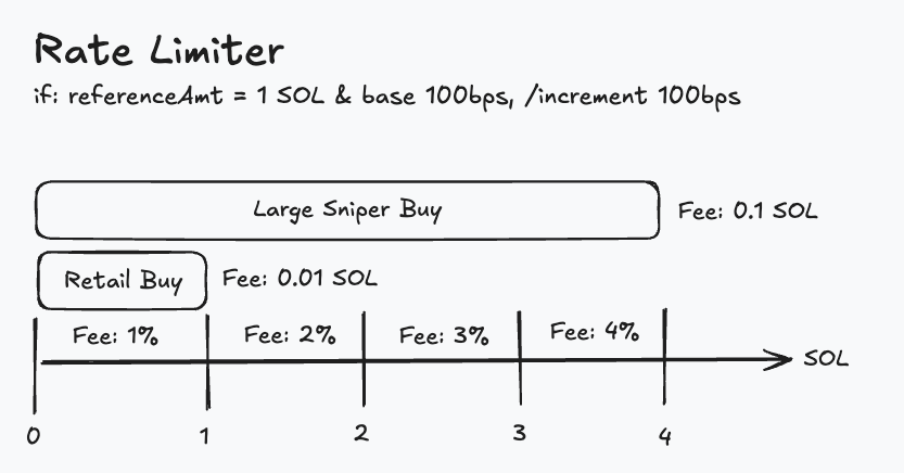Лимитирующий механизм работает, применяя динамическое расписание сборов на ордера покупки в зависимости от количества использованного SOL. Справочное значение установлено на 1 SOL с базовым сбором 100 базисных пунктов (bps). Каждое увеличение на 1 SOL увеличивает сбор на 100 б.п. Например, покупка 1 SOL влечет за собой сбор в 1%, в то время как покупка 4 SOL влечет за собой сбор в 4%. Более крупные закупки снайперов, такие как превышающие 4 SOL, платят до 0.1 SOL в сборах.