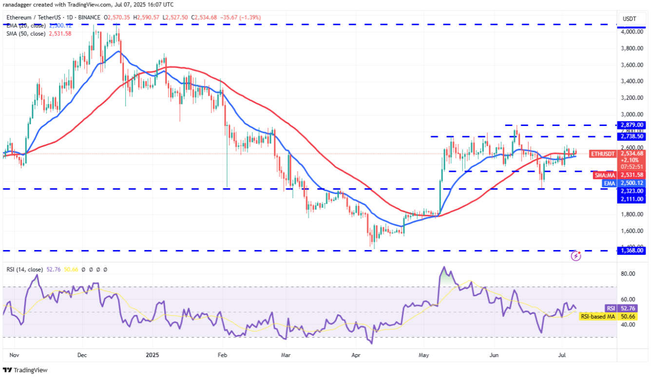 Позиции в лонг пытаются поднять цену выше 2,635 долларов, открывая путь для восстановления до 2,738 долларов. Однако область от 2,738 до 2,879 долларов может составлять сильное сопротивление. Если цена откатится от этой области, ETH/USDT может получить поддержку на 20-дневной скользящей средней (EMA). Если цена отскочит от 20-дневной скользящей средней, позиции в лонг продолжат пытаться поднять цену выше 2,879 долларов.