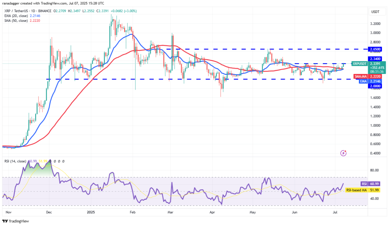 В последние несколько дней позиции в лонг постоянно удерживали XRP выше 20-дневной EMA (2,20 доллара), что указывает на то, что позиции в шорт не предприняли действительно агрессивных действий.