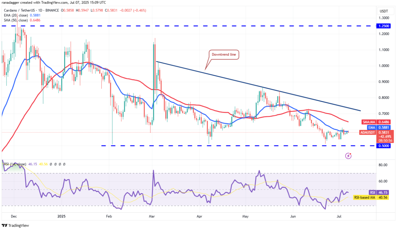 Cardano (ADA) удерживает 20-дневную EMA (0.58 долларов), что указывает на то, что позиции в лонг все еще сталкиваются с покупательским давлением.