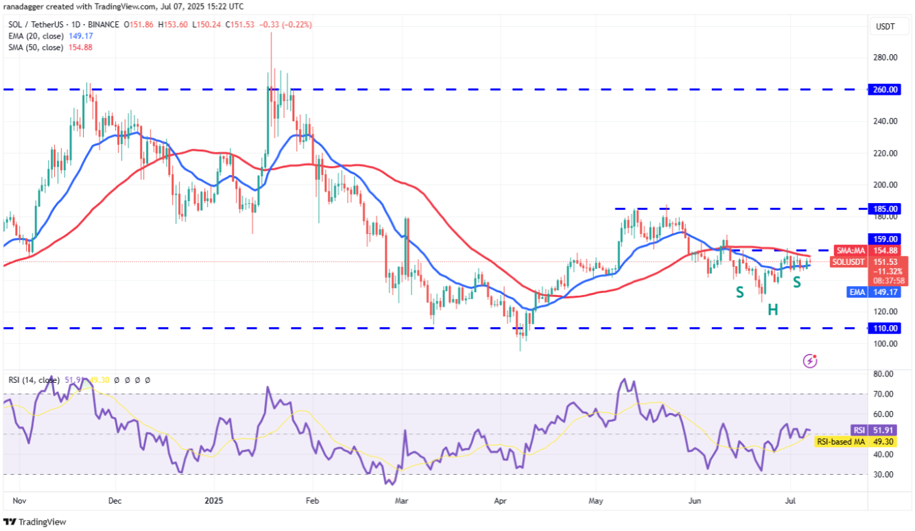 позиции в лонг в воскресенье успешно подняли Solana (SOL) выше 20-дневной EMA (149 долларов), но с трудом пробили 50-дневную SMA (154 доллара).