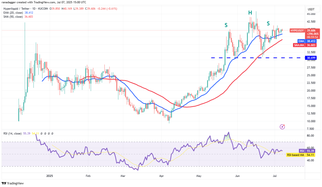 В последние несколько дней покупатели продолжали поддерживать Hyperliquid (HYPE) выше 20-дневной EMA (38,41 долларов), что указывает на наличие покупательского давления на более низких уровнях.