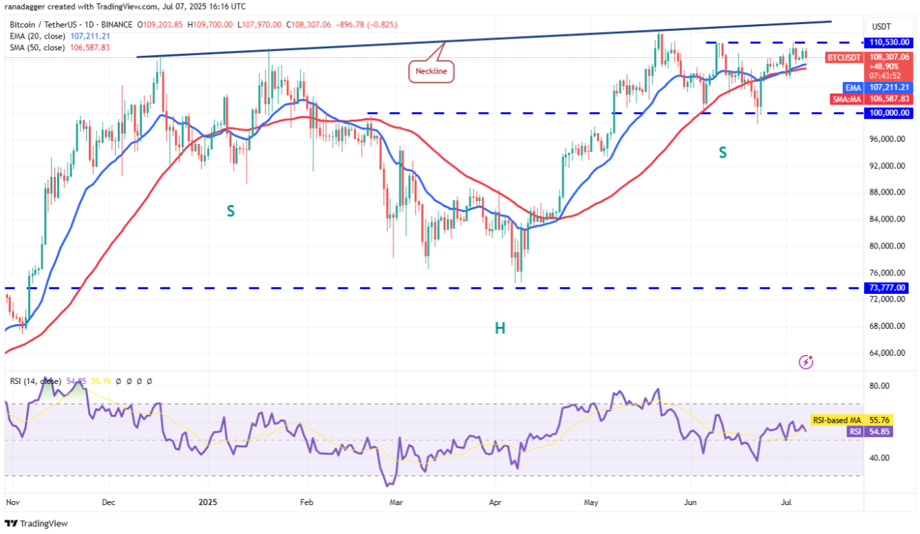 Биткойн в настоящее время торгуется в узком диапазоне между 20-дневной EMA (107,211 долларов) и уровнем сопротивления 110,530 долларов.