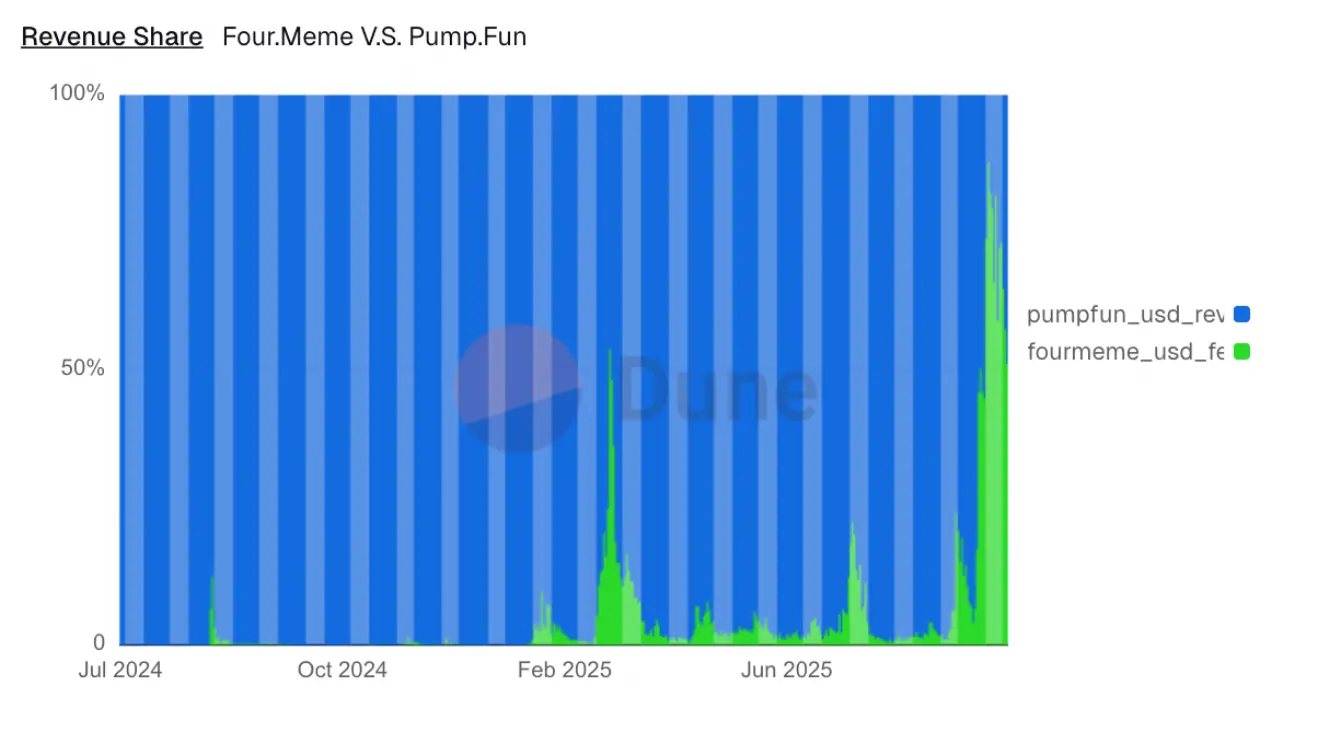 С августа количество новых токенов на блокчейне Solana заметно сократилось. Данные Solscan показывают, что с августа по середину октября количество новых токенов на Solana снизилось с среднего уровня 35000–40000 до 15000–20000, что отчасти связано с ухудшением рыночной конъюнктуры криптовалют. Кроме того, как видно из следующей диаграммы, с октября доля рынка fourmeme по сравнению с Pump.fun достигла максимума в 83,9%, а доходность — 87,8%. Это свидетельствует о всплеске китайского меме на BSC с октября, что привело к перераспределению значительных средств. Данные с цепочки показывают, что 8 октября объем торгов на DEX BNB Chain достиг примерно 6,05 миллиарда долларов, что стало вторым по величине показателем в этом году, что указывает на значительное повышение спекулятивной активности в экосистеме Binance, и значительная часть ликвидности, ранее активной на блокчейне Solana, была привлечена туда.