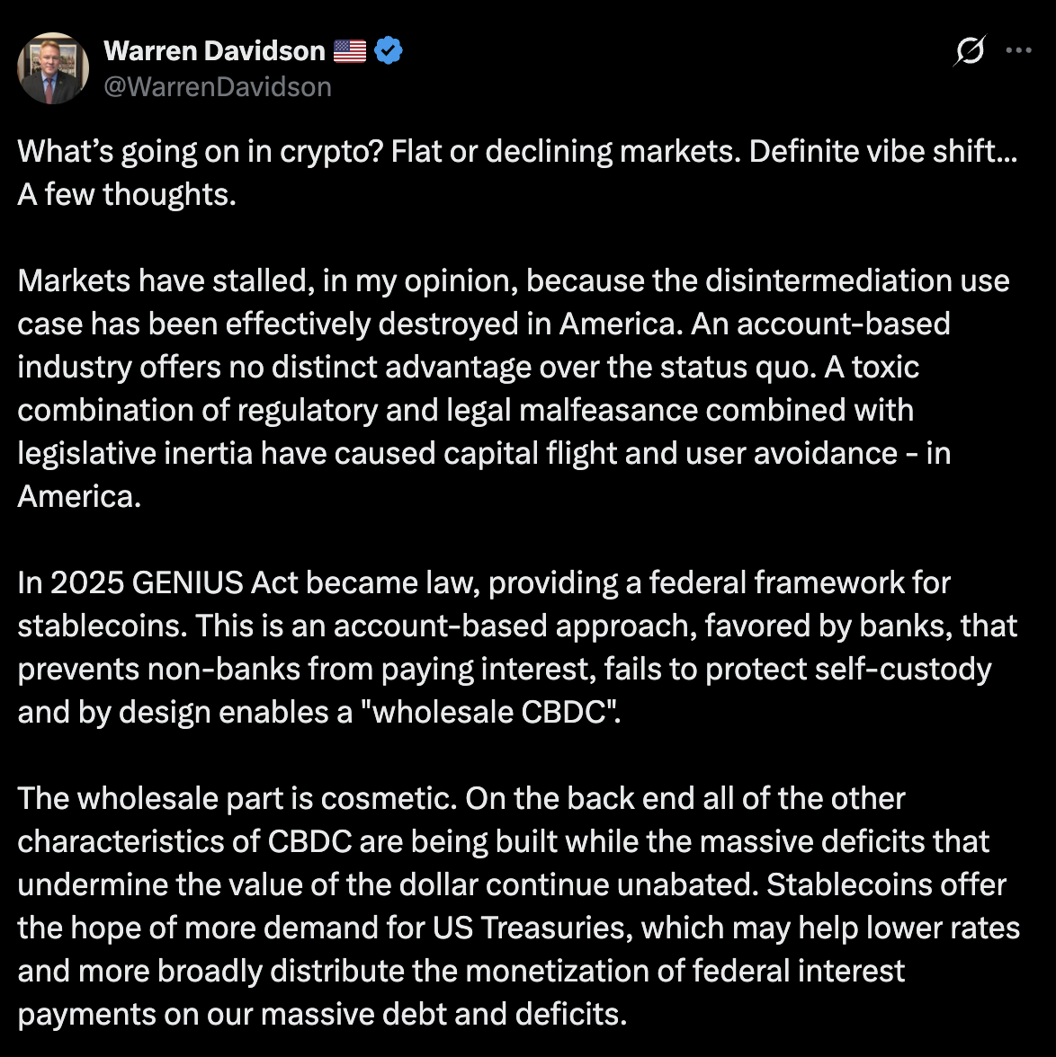 Источник: X/@WarrenDavidson Недавно член Палаты представителей США Уоррен Дэвидсон резко предупредил о тенденциях регулирования криптовалют в США, прямо указав, что текущие законы постепенно отходят от основных ценностей возникновения криптоактивов