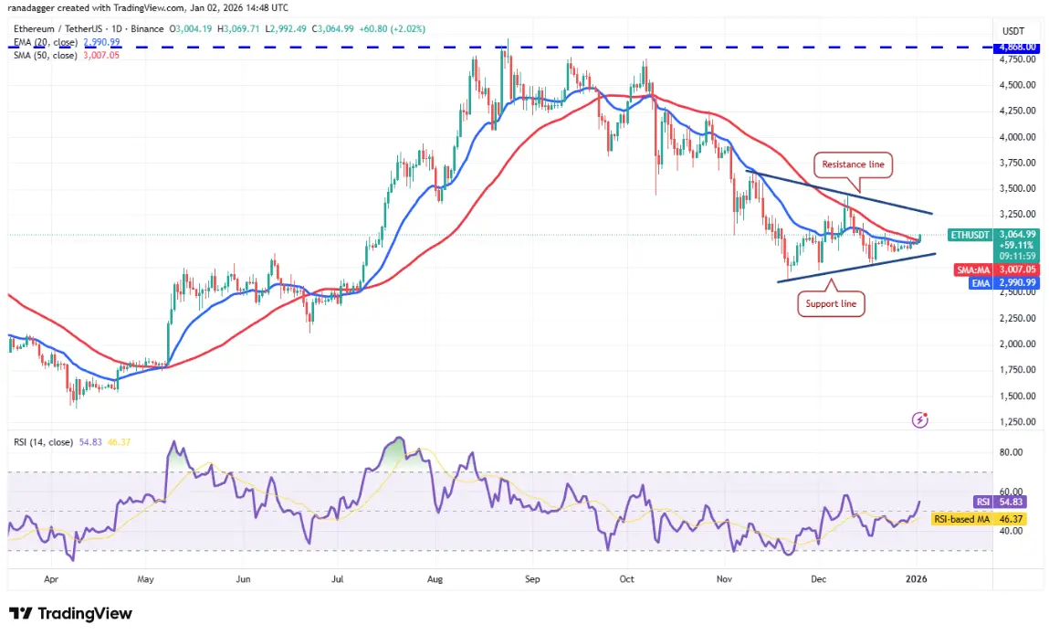 Ежедневный график ETH/USDT | Источник: TradingViewЕсли цена закроется выше 50-дневной SMA на уровне $3,007, пара ETH/USDT может подняться до линии сопротивления паттерна. Ожидается, что медведи будут жёстко защищаться, потому что при прорыве ETH может открыть восходящий импульс к отметке $4,000.