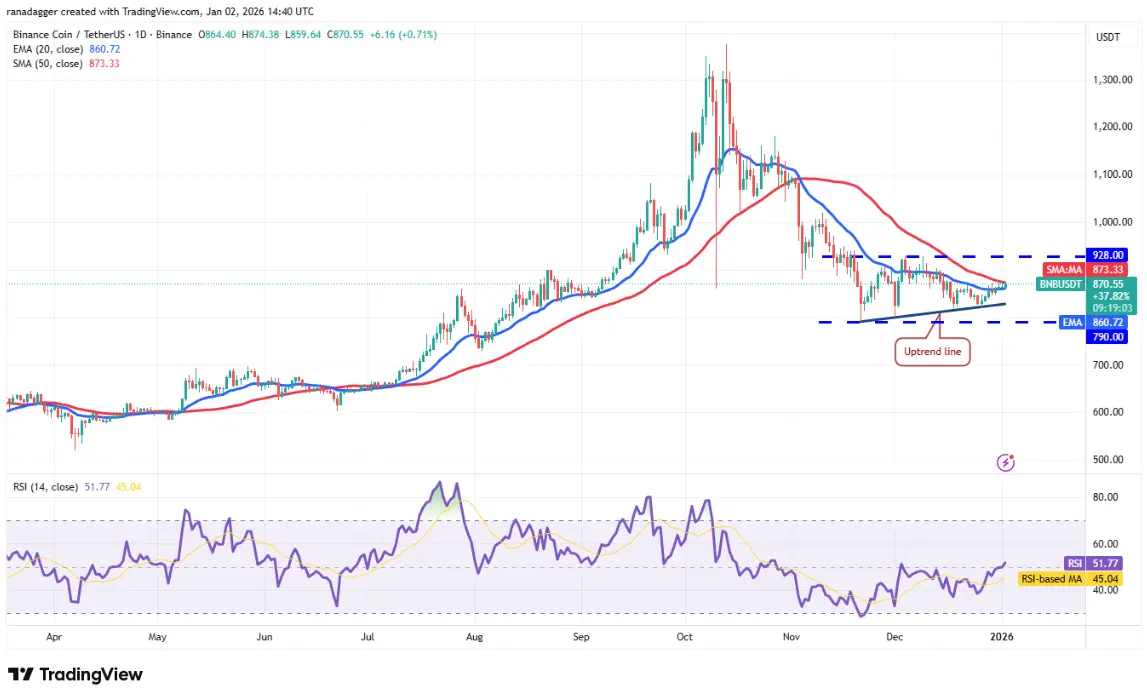 Медведи пытаются защитить 50-дневную SMA на уровне $873, но положительный сигнал — быки BNB сохраняют бычье давление