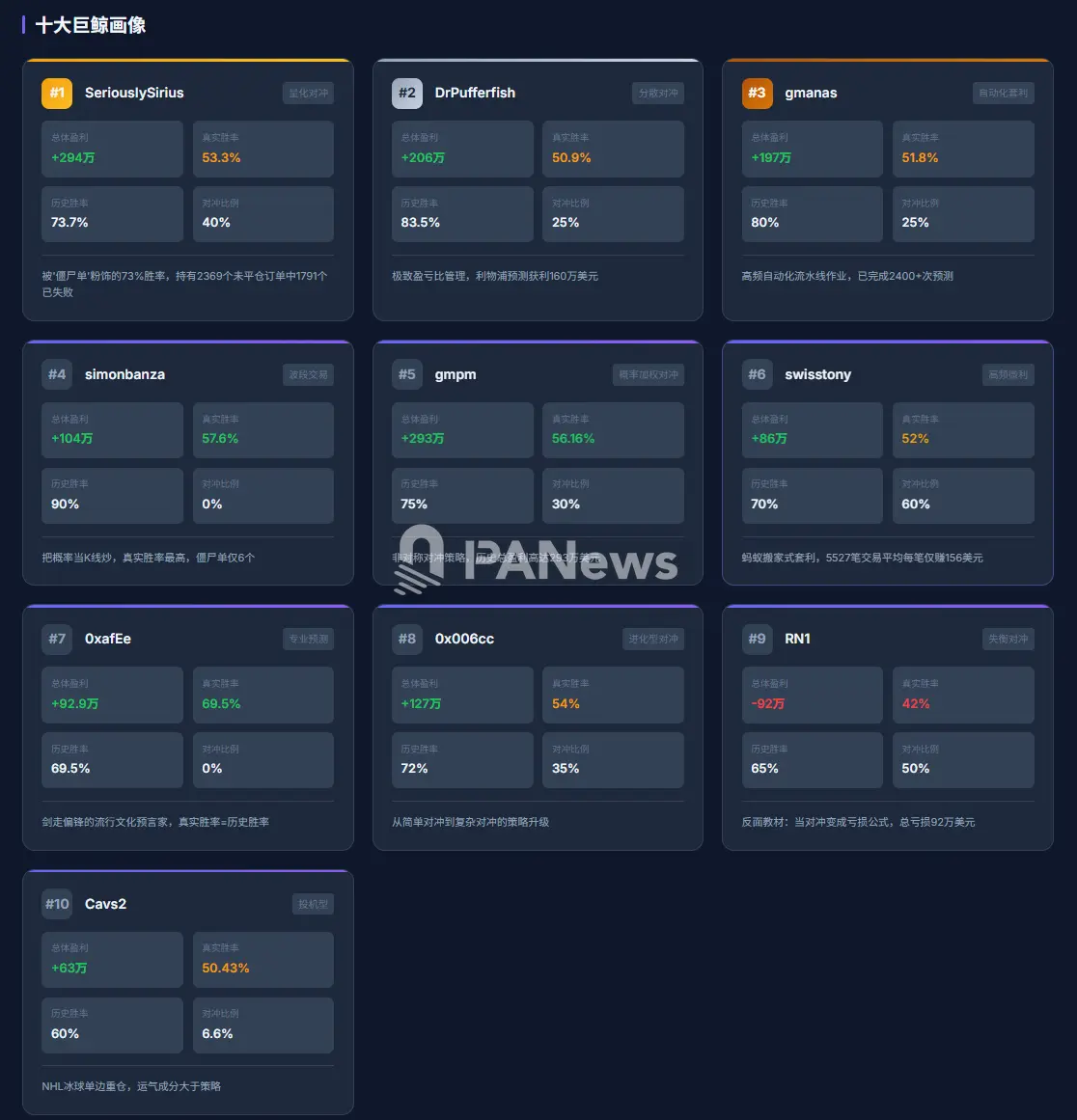 Но за этой популярностью — насколько эффективны эти, казалось бы, хитрые и логичные стратегии на самом деле? И как именно они реализуются? PANews провел глубокий анализ 27 000 сделок крупнейших китов, входящих в топ-10 по прибыли на Polymarket в декабре, чтобы раскрыть истинную природу их доходов.