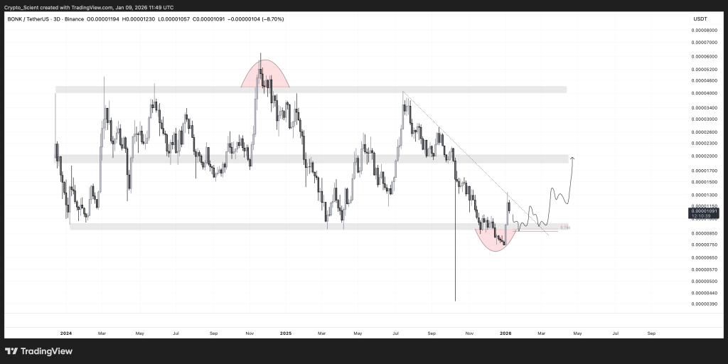 Цена BONK долгое время находилась внутри широкого макро диапазона, колеблясь туда-сюда без последующего движения. Такая среда обычно приводит к переполненности позиций и хаотичным графикам. Согласно Crypto_Scient, эти условия наконец начали разворачиваться после того, как BONK кратковременно отклонился ниже нижней границы диапазона и позже прорвал сопротивление с другой стороны.
