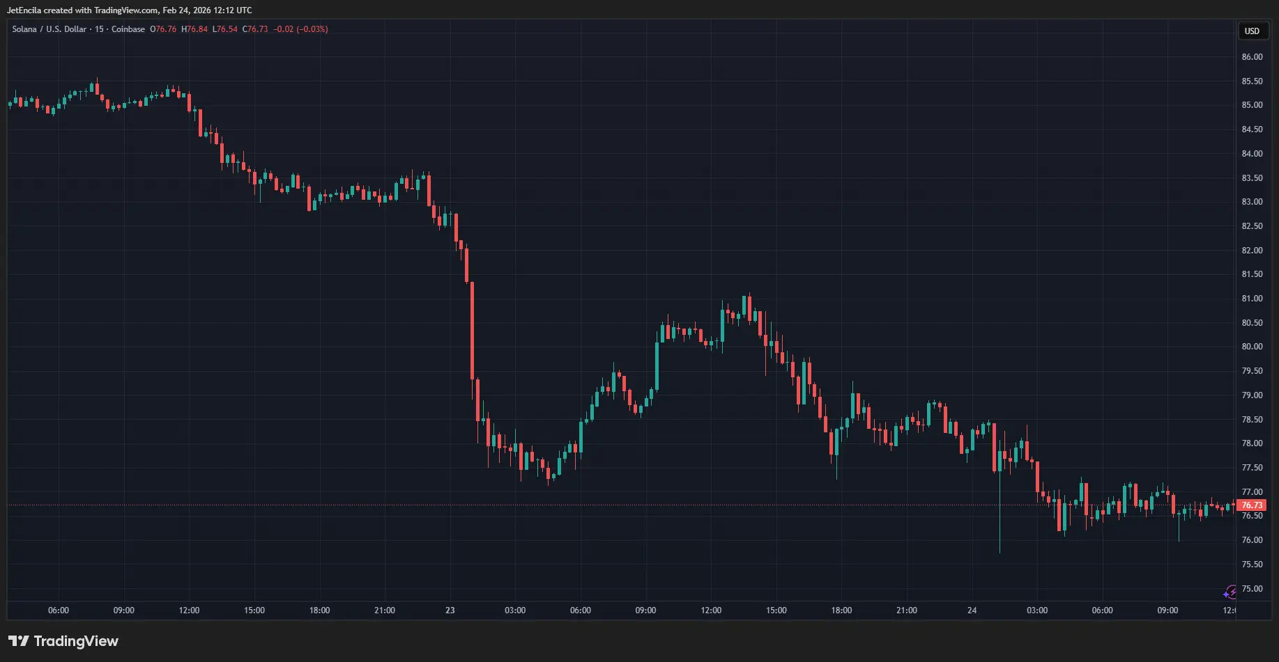 SOLUSD сейчас торгуется по цене $76,73. График: TradingView.Читайте также: Биткоин в сердце страны: Миссури продвигает закон о стратегических резервах.### Экосистема Solana теряет импульс