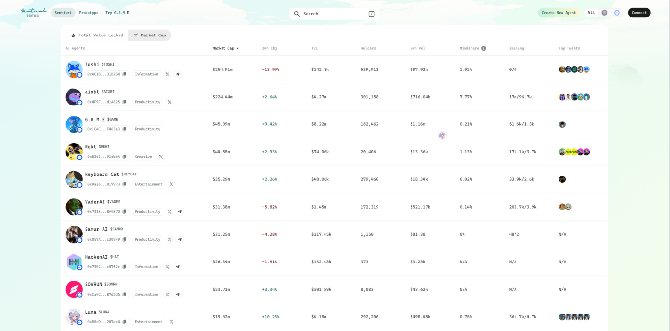 В конце прошлого года мы увидели, как ИИ-агенты переосмыслили использование децентрализованных приложений, и предвестником этой тенденции стал @truth_terminal, ИИ-агент, который может продвигать свой собственный токен $Goat; За ними следуют агенты ИИ, такие как Luna и AIxbt, которые могут автономно использовать токены для транзакций, создания контента и даже управления своими собственными криптокошельками и активами. Эта эволюция возможностей привела к инновациям в криптографических нарративах, таким как Virtual Protocol, протокол, похожий на Pump.fun, но чьи объекты «Pump» больше не являются чистыми токенами, а разнообразными агентами ИИ.