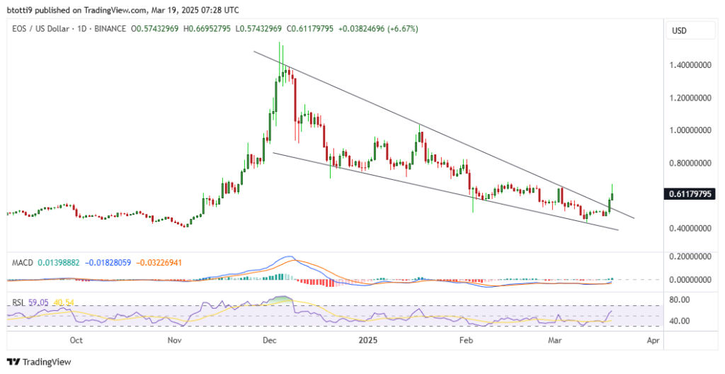 Токен EOS торговался ниже с тех пор, как достиг сопротивления около $0.64 3 марта 2025 года.