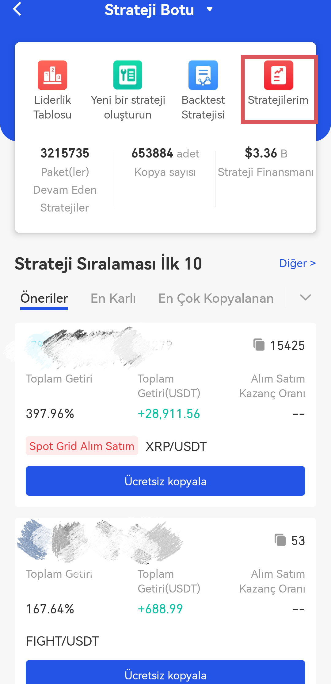 Aktif stratejileri görüntülemek için "Stratejilerim" üzerine tıklayın.
