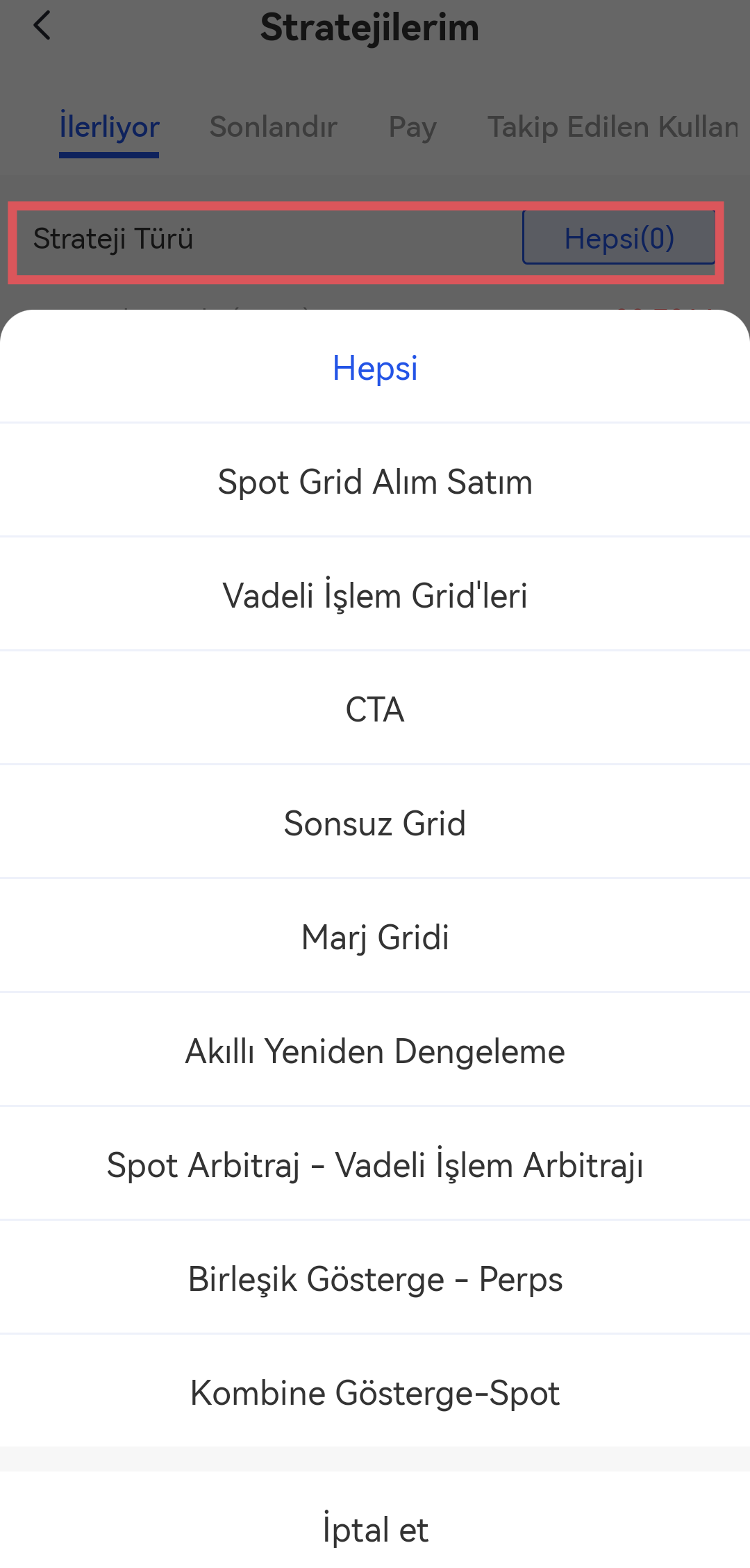 Görüntülemek istediğiniz geçmiş grid veya stratejiyi seçmek için "Tümü" üzerine tıklayın.