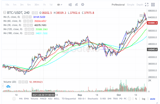 Bu Gate vadeli işlem BTC piyasasının 4 saatlik mum grafiğidir. Yukarıdan aşağıya doğru sıralanan MA30, MA60, MA120 ve MA180'in hepsinin yükseliş eğiliminde olduğunu gösteriyor. Yükseliş formasyonu oluşturduktan sonra MA5, MA30'un üzerine çıktığında Golden Cross ortaya çıkar. Ardından gelen uzun süreli yükseliş dalgası sırasında BTC'nin fiyatı 30.000 ABD Dolarından 60.000 ABD Dolarının üzerine çıktı ve bu da %100'ün üzerinde bir artışa işaret etti.