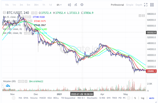 Yukarıdaki resim Gate vadeli işlem BTC piyasasının 4 saatlik mum grafiğini göstermektedir. Bu grafik, aşağıdan yukarıya doğru sıralanan MA5, MA30, MA60, MA120 ve MA180 ile karakterize edilen ve tamamı aşağı doğru olan bir düşüş eğilimini göstermektedir. Bunu takiben MA5 düşer ve art arda orta ve uzun vadeli hareketli ortalamaların (MA30 ve MA60) altına geçerek Death Cross'nı oluşturur. Bu geçiş, BTC fiyatının 68.000 ABD Dolarından 28.000 ABD Dolarına düştüğü bir düşüş döngüsü başlattı.