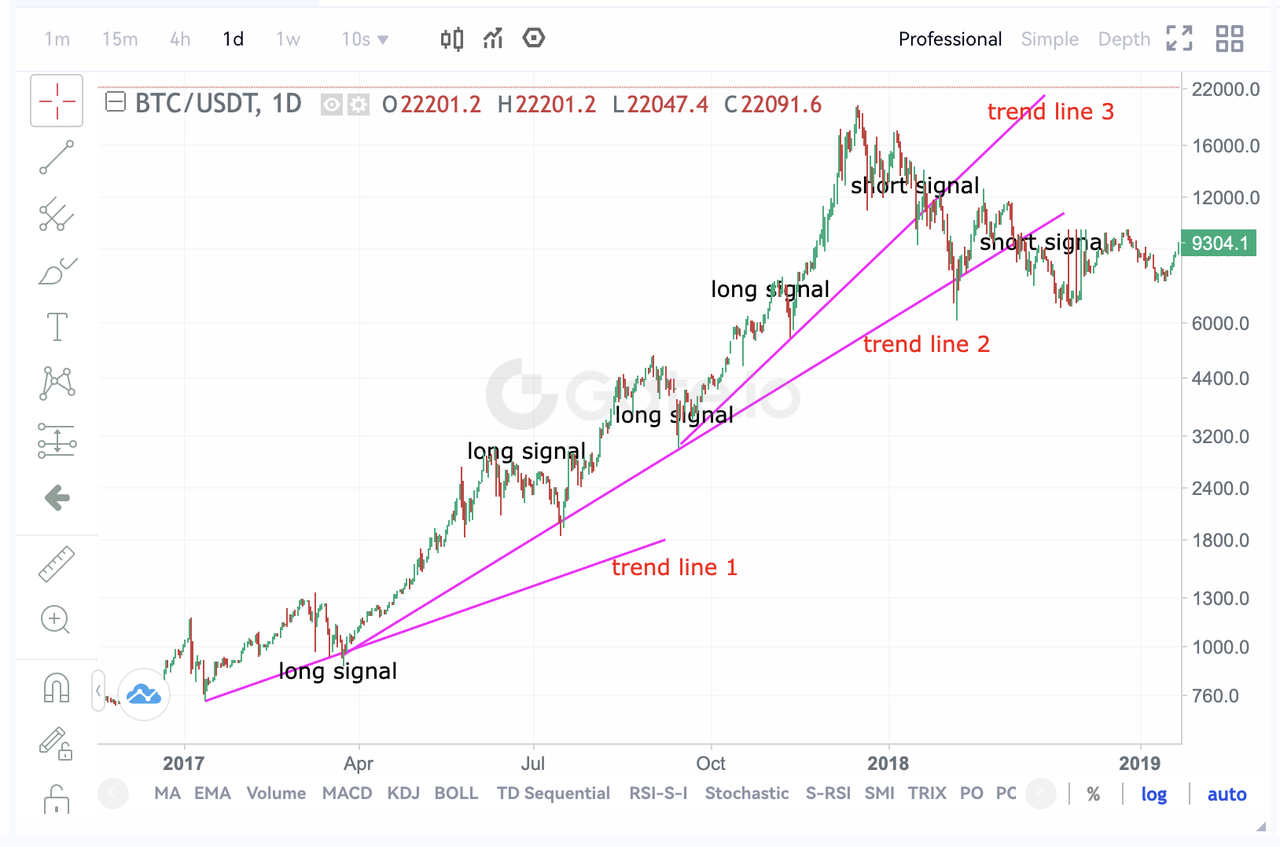 A. Uzun vadeli bir yükseliş trendi sırasında döviz fiyatının kısa vadeli veya orta vadeli düşüş trendi çizgisinin üzerine çıkması, pozisyon satın alma ve artırma sinyalidir; döviz fiyatının kısa vadeli veya orta vadeli yükseliş trend çizgisinin altına düşmesi pozisyonların azaltılmasına yönelik bir sinyaldir; döviz fiyatı uzun bir süre boyunca uzun vadeli yükseliş trend çizgisinin üzerinde hareket etmeye devam ederse, bu mevcut varlıklarınızı korumanız gerektiğine dair bir sinyaldir.