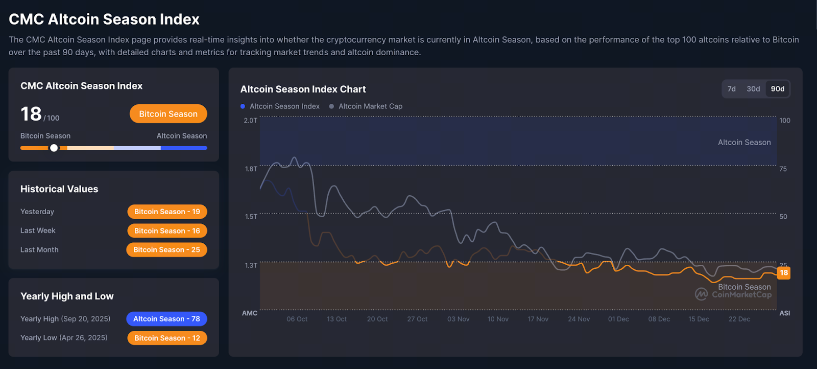 In the second half of 2025, the cryptocurrency market has experienced pronounced divergence and volatility. As year-end approaches, most major tokens have sharply pulled back from their highs, with risk appetite fading and overall market capitalization contracting significantly. Altcoins, in particular, have lagged behind Bitcoin. According to the latest data, the Altcoin Season Index has fallen to just 17, indicating that most altcoins have underperformed Bitcoin over the past 90 days. This marks a return to “Bitcoin Season.”