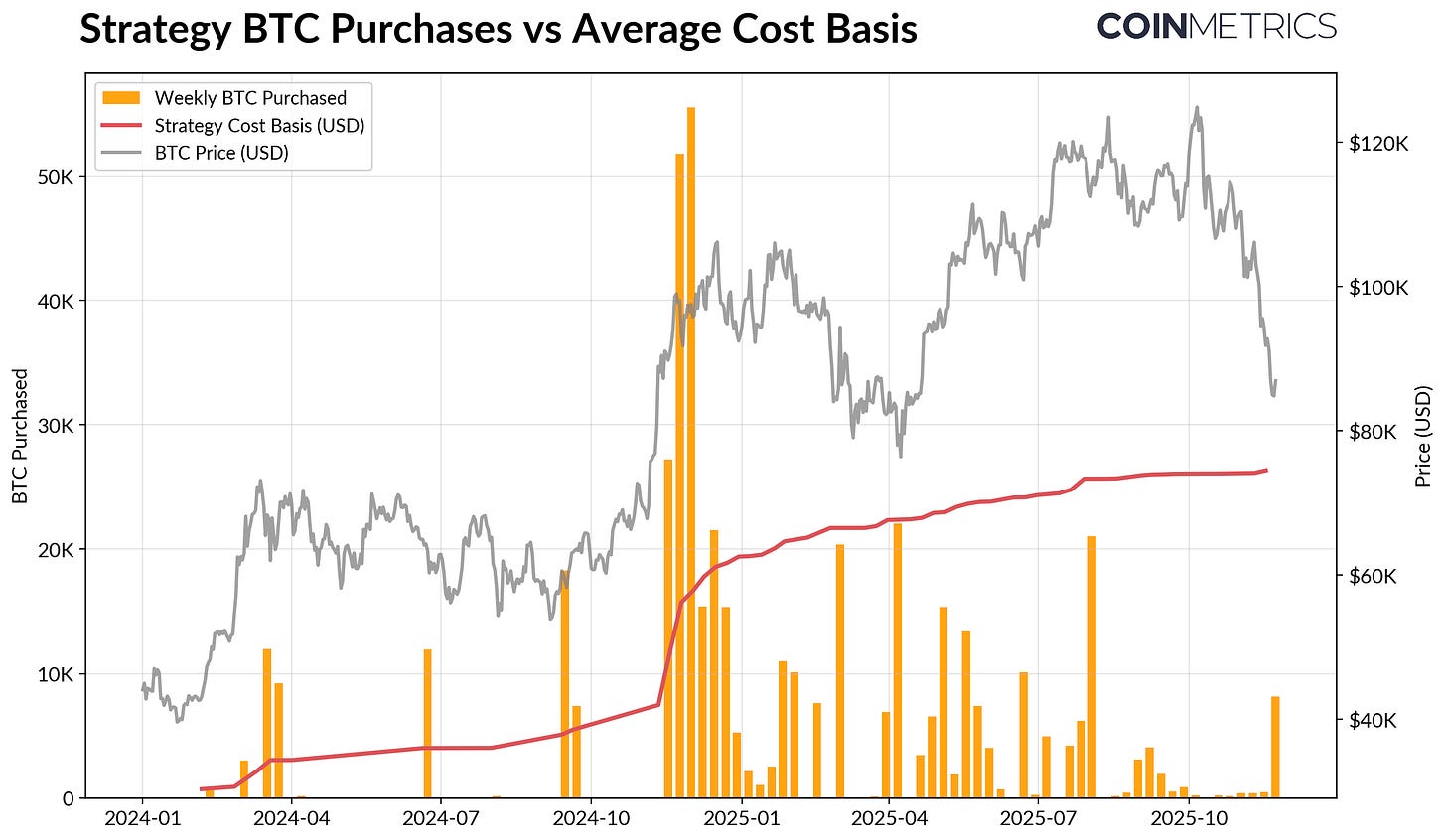 Strategy, the largest DAT currently owns 649,870 BTC (~3.2% of Bitcoin’s current supply) at an average cost of $74,333. As seen in the chart below, Strategy’s accumulation accelerated sharply when BTC was rising and its equity valuation was strong, and has slowed recently, rather than being a source of active selling. Even so, Strategy still sits on unrealized gains, with its cost basis below the current market price.