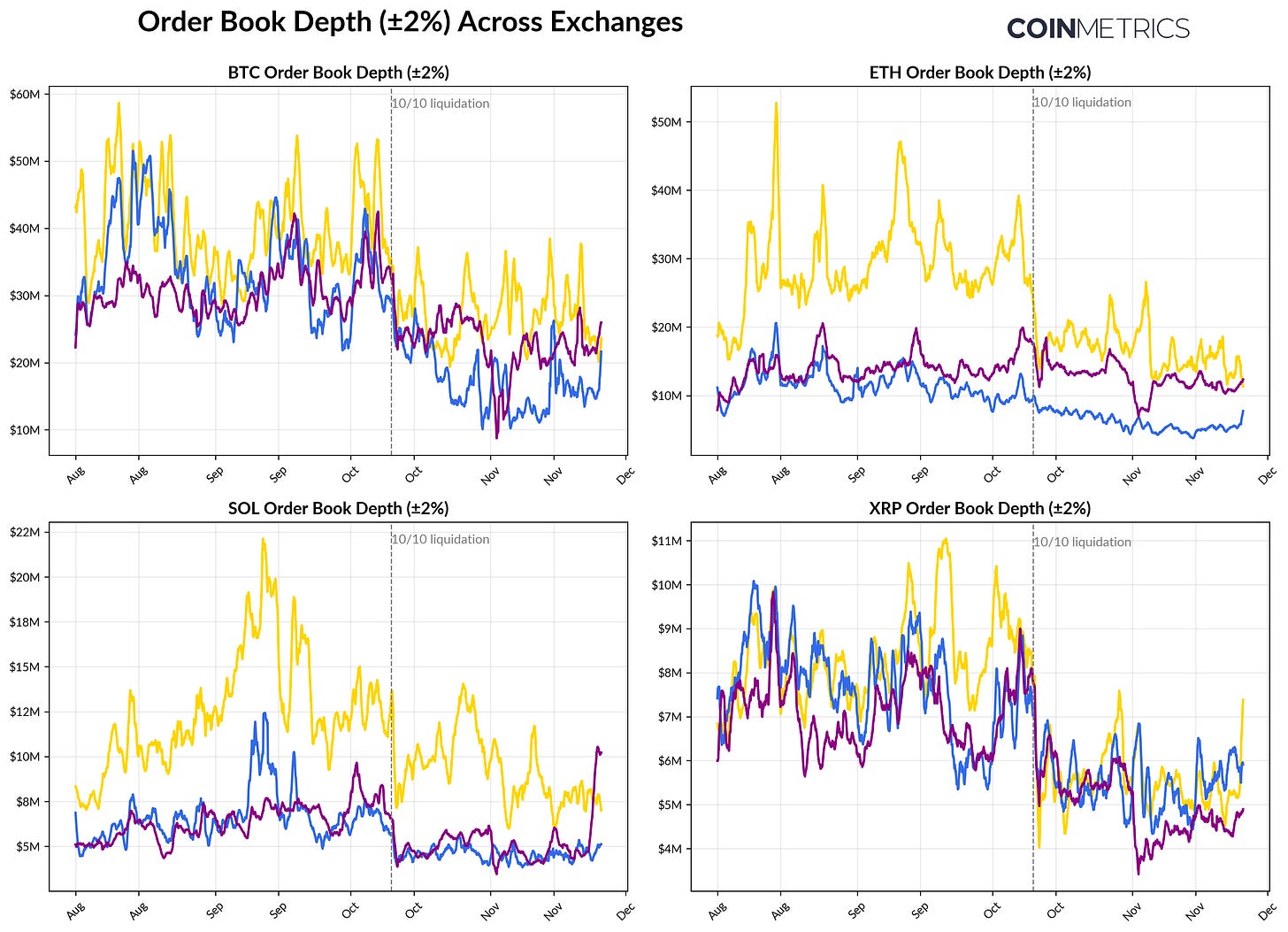 • Spot liquidity has yet to recover across majors and altcoins, keeping markets fragile and more susceptible to outsized price moves.