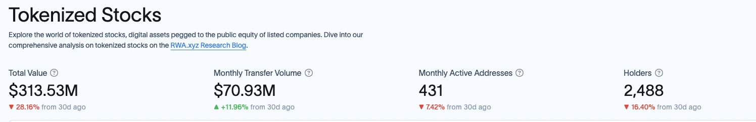 U.S. stock tokenization does have multiple advantages such as breaking geographical and KYC restrictions, supporting 24/×7 trading, allowing non-US users to hold U.S. assets at low cost, and avoiding high cross-border fees. However, although institutions have predicted that the tokenization of U.S. stocks will bring about a trillion-dollar RWA market, according to RWA.xyz data, the size of the entire RWA is only about $23 billion, of which tokenized stocks account for only $313 million, and the market size is far from the height imagined.