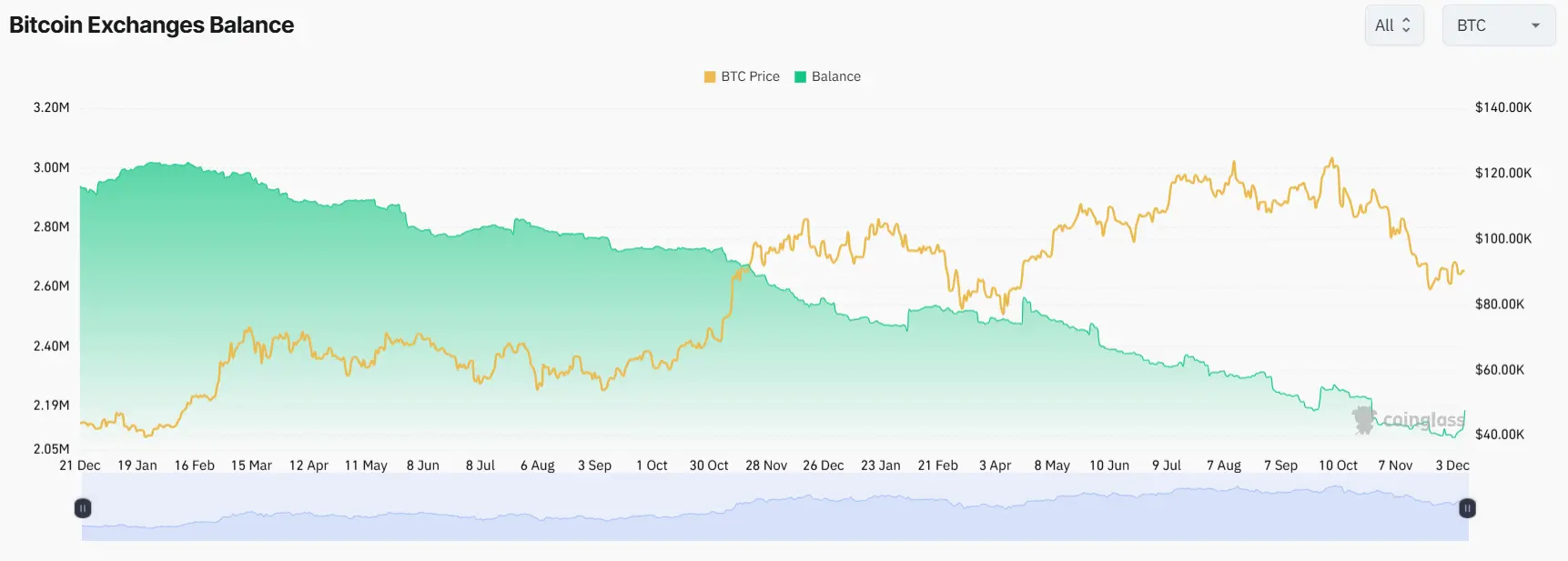 Crypto data analytics platform CoinGlass shows the same trend, with Bitcoin held on exchanges sitting at around 2.11 million as of Nov. 22, when Bitcoin was suffering through a correction and trading hands for around $84,600.