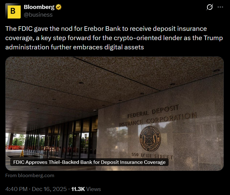 Erebor recently received preliminary conditional approval from the US Office of the Comptroller of the Currency (OCC), a key regulatory hurdle toward becoming a fully licensed bank.