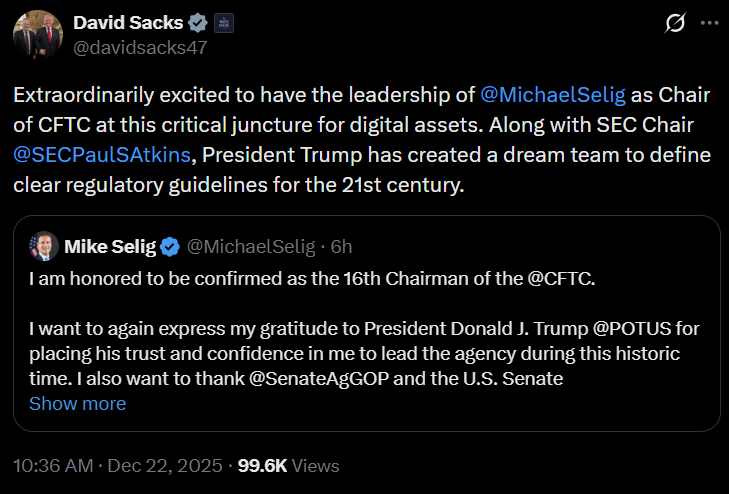 His comments followed developments at the CFTC, including leadership changes involving Mike Selig, underscoring expectations of a more defined regulatory framework for digital assets.