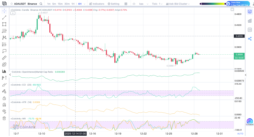 On the 4-hour chart, the ADA price bounced off the $0.339 area and has been slowly inching higher since. That bounce was important. It’s where sellers clearly lost momentum and buyers finally stepped in.