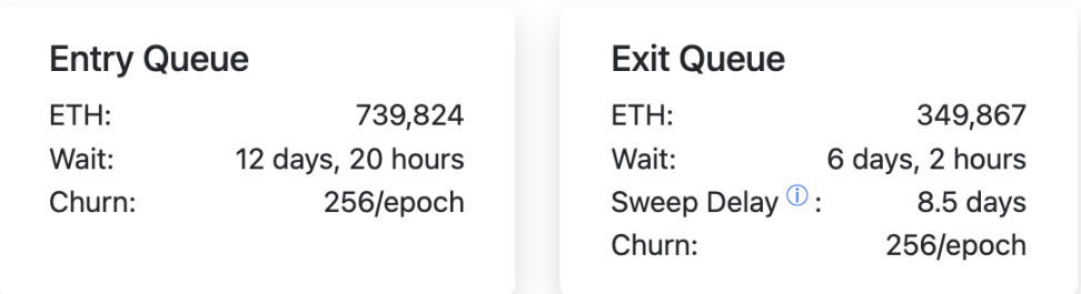 Currently, the maximum number of validators that can be activated or exited per epoch (about 6 minutes and 24 seconds) is set at 256 ETH, equivalent to a processing capacity of approximately 57,600 ETH per day.