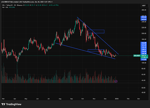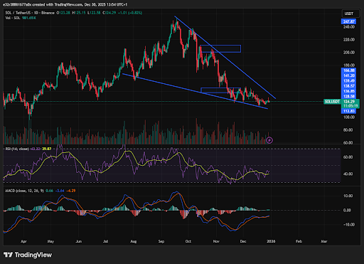 According to the charts, Solana trades inside a descending wedge on the daily chart.