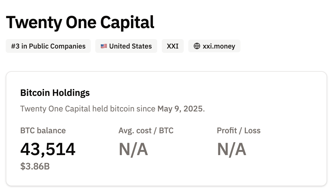 Image Source: Bitcoin Treasuries XXI also holds about 43,514 BTC, ranking third among publicly listed companies’ Bitcoin holdings worldwide.