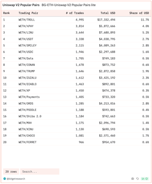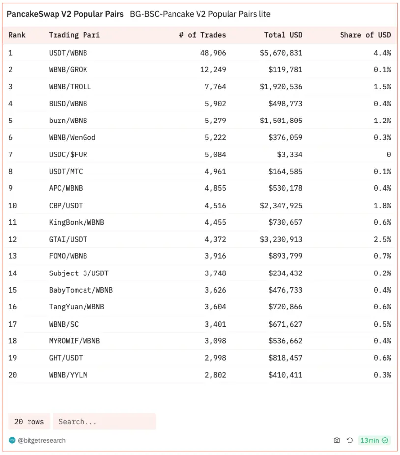 TROLL (Token): The TROLL token with the same name on the BSC chain fell sharply after experiencing a sharp rise yesterday. Its token has nothing to do with the token on ETH and is a counterfeit token with the same name. The 24-hour trading volume is nearly 2 million US dollars, and 7,000 transactions occurred. The token is suspected of malicious market making by the project party, and the risk of participation is high.