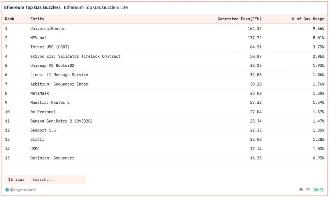 The main Gas consumption of the Ethereum mainnet currently comes from the following categories: 1. Uniswap, 2. Stable currency USDT, 3. MEV, 4. Various Layer2 sequencers, 5. TG trading bot.