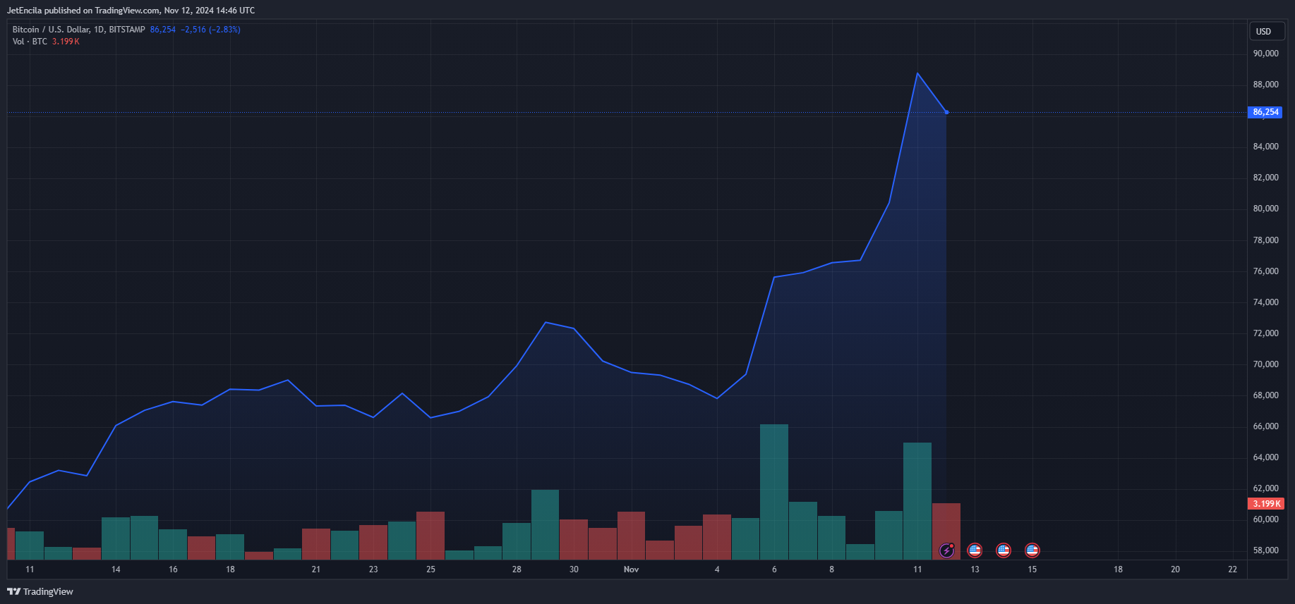 BTCUSD trading at $86,340 on the daily chart: TradingView.com