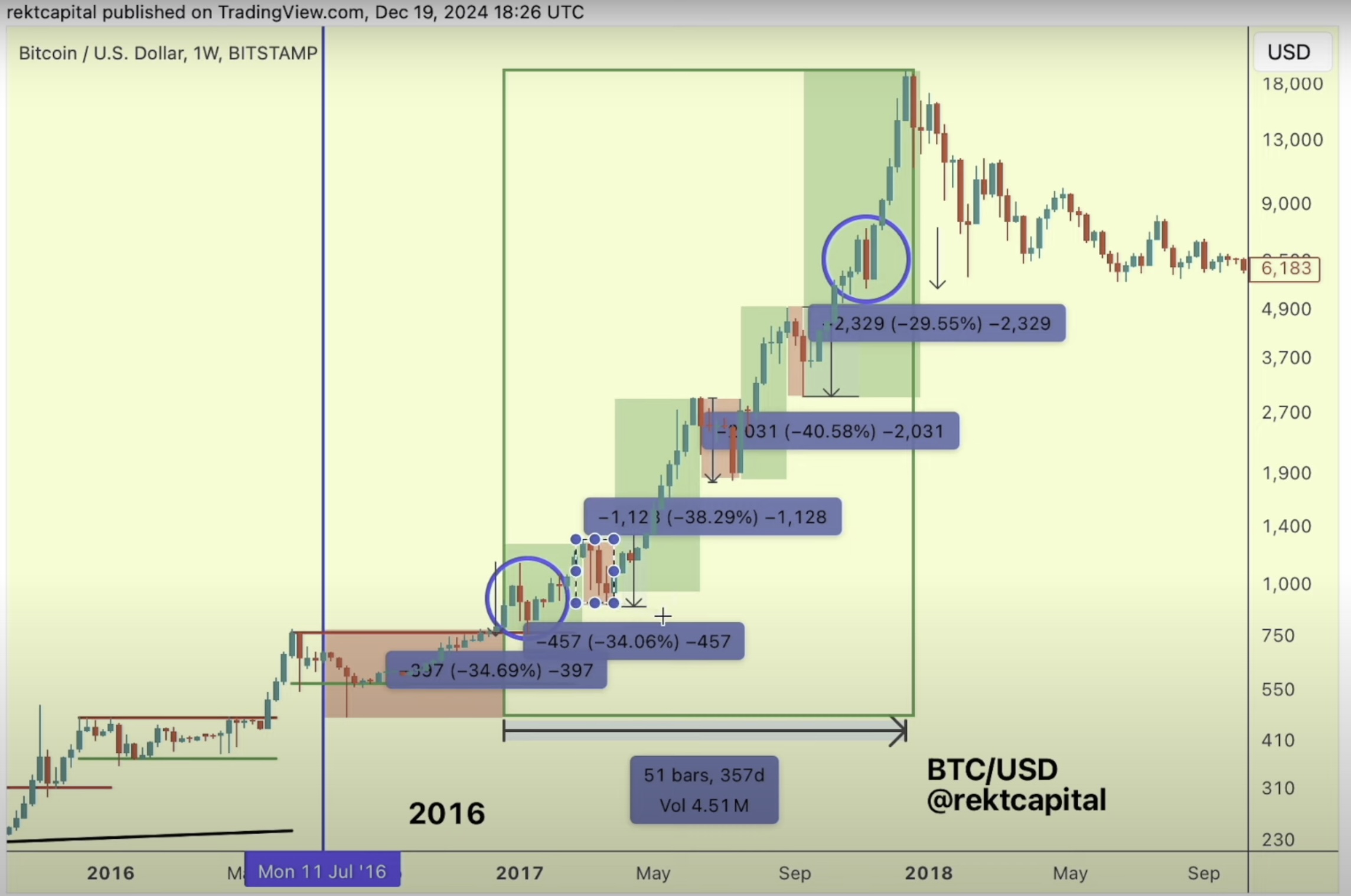 “It’s really important to understand what those corrective periods have looked like in the past, and 34% has been something of a recurring theme in 2016, 34% in week eight. We had 34% when it came to confirming the first price discovery uptrend in the very beginning of that uptrend. We got 40%, 38% 29% in 2016-2017. So we’ve seen pullbacks take place which were quite deep in price discovery in the past.”