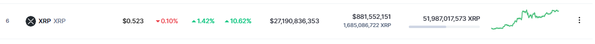 At the time of writing, the price of XRP on CoinMarketCap currently stands at $0.523. This figure highlights a slight increase of 1.4% within the past 24 hours, and a decent climb of 11% over the course of seven days. These figures are indicative of the significant growth it has experienced in recent times, with a staggering 8,679.89% increase since its initial introduction to the market.