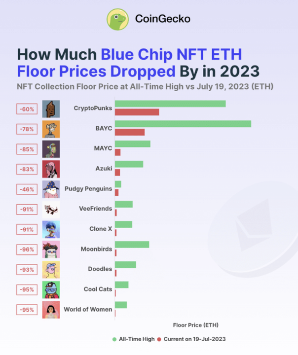 Unquestionably, these distinctive digital assets have been a significant force behind the NFT transformations that have taken place. Despite the wide iety of NFT collections and their accomplishments, it is crucial to recognize that some particular ones have recently been severely affected by market pressures and are now beginning to fall from their lofty positions.