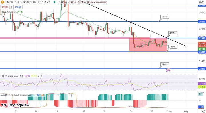 Currently, Bitcoin is positioned slightly under the $29,500 hurdle, which is further reinforced by a downward trend line visible in the four-hour