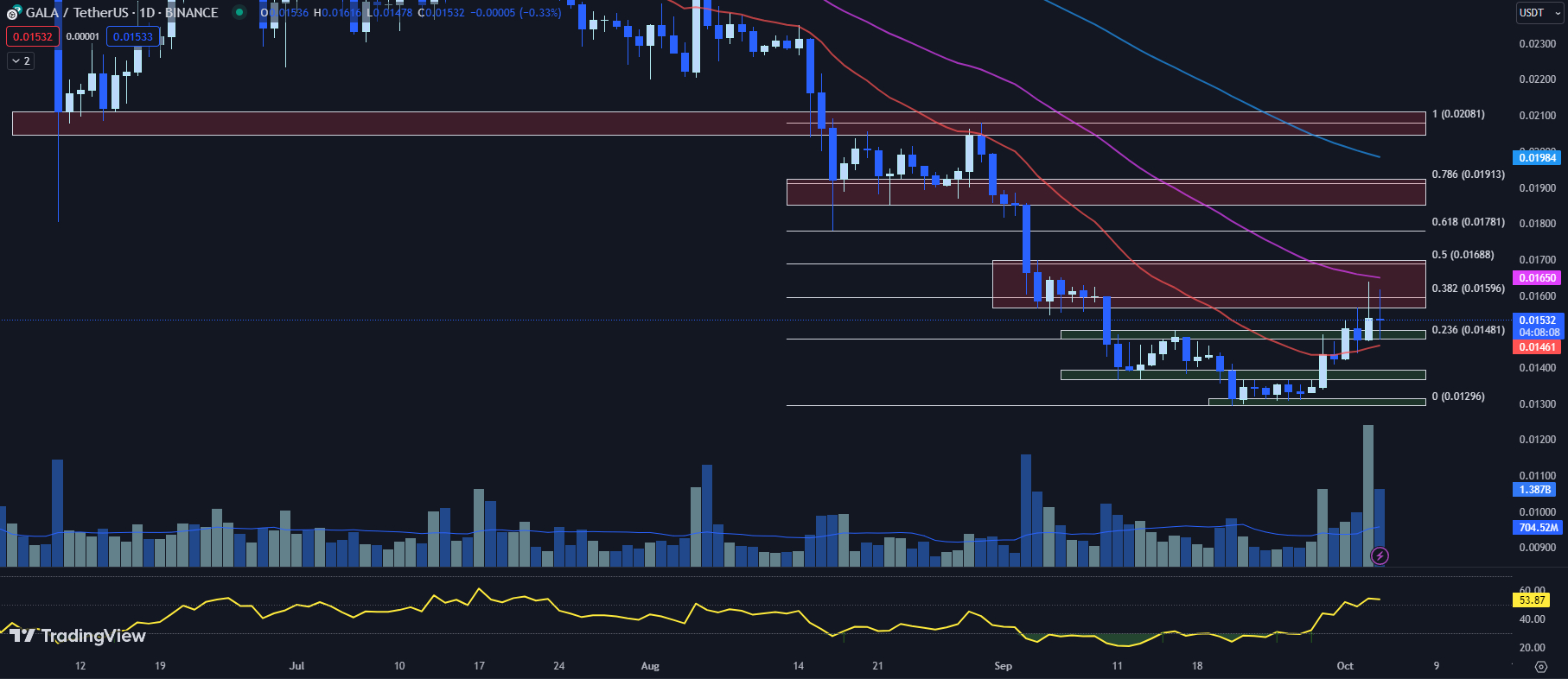 The 20-day EMA for the GALA price currently stands at $0.01461, below the 50-day EMA of $0.01650.