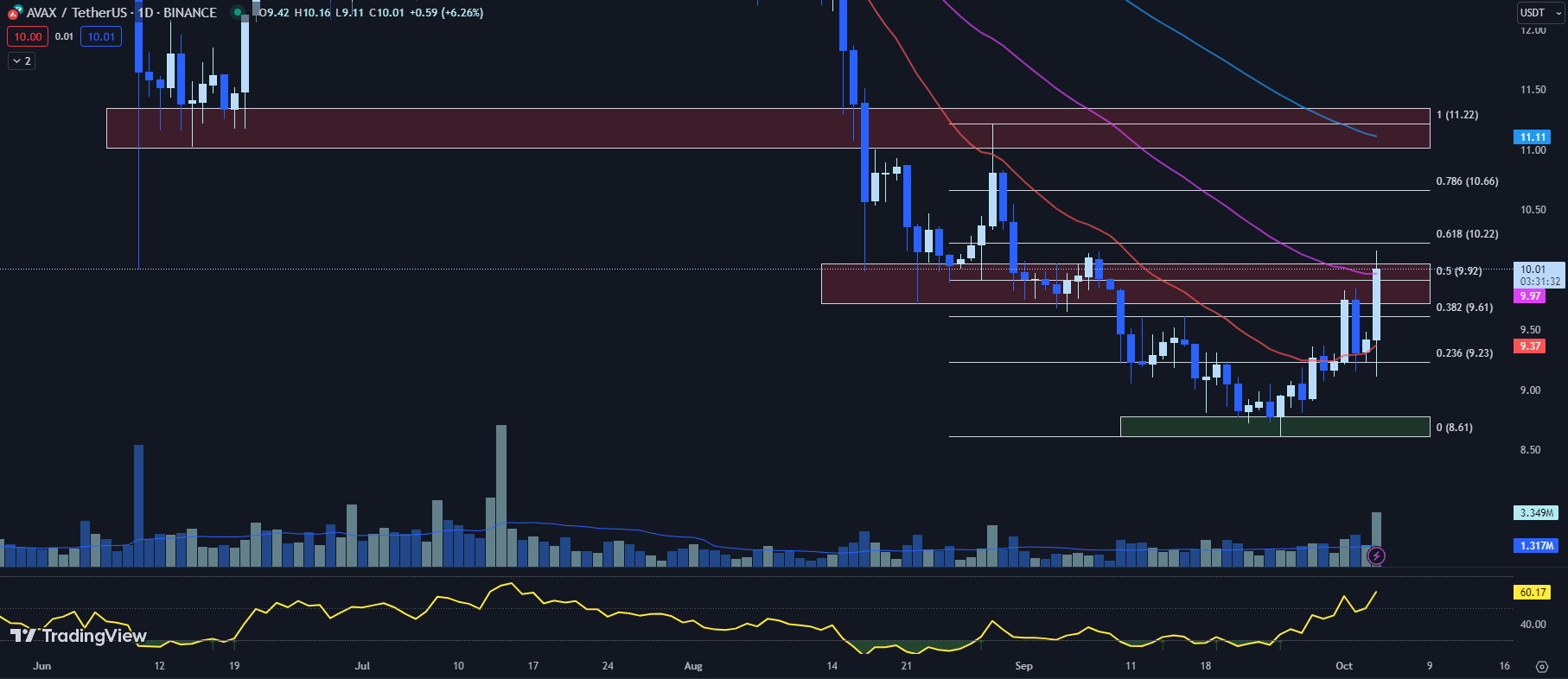 AVAX currently faces immediate resistance between $9.72 and $10.05, which aligns with the reverse Fib 0.5 level at $9.92 and the 50-day EMA of $9.97. Overcoming this zone could propel the AVAX price higher.