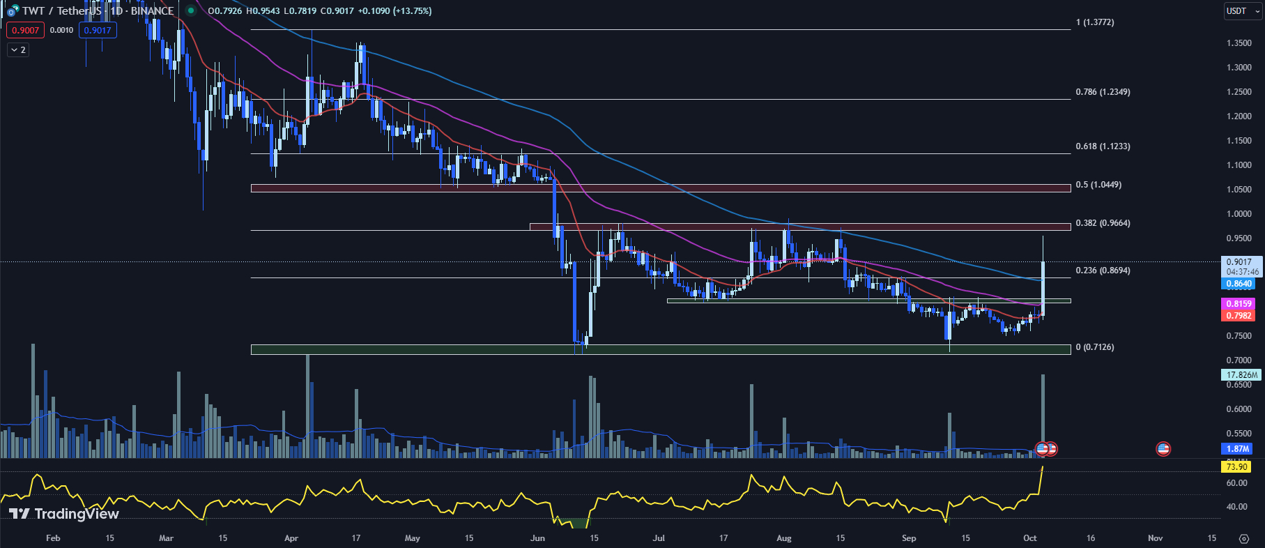 Source: TradingView / TWTUSDTBucking the broader cryptocurrency market’s relatively low volatility, the TWT price is up by a significant 13.75% so far today as it currently trades at $0.9017.