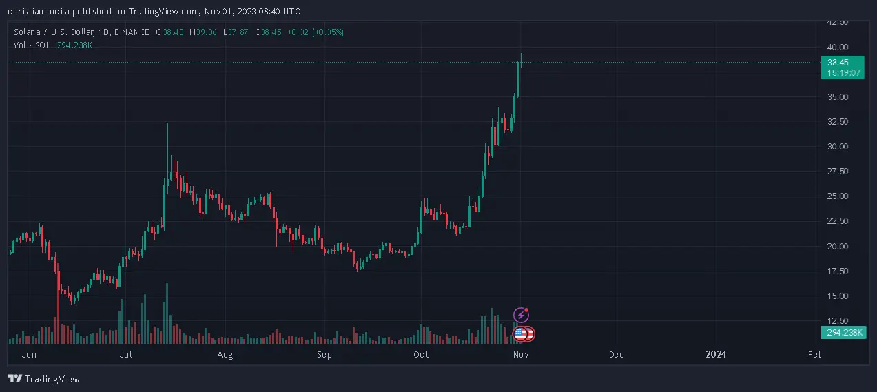 The journey toward $40 has been an exciting one, with SOL appreciating by approximately 80% from its intramonth low of around $21.07, a level it touched near October 12, as per CoinMarketCap figures. While SOL has demonstrated its potential, the looming question on everyone’s mind is whether it can indeed break through the $40 resistance and continue its bullish run.