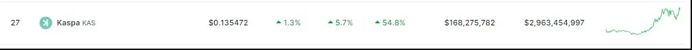 At the time of writing, KAS was trading at $0.135, up nearly 6% in the last 24 hours, and commanding a solid 55% rally in the last seven days, data from crypto price aggregator Coingecko shows.